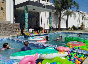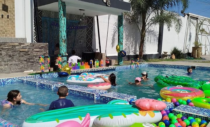 Espacios amplios con alberca para fiestas infantiles y reuniones familiares.