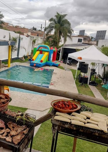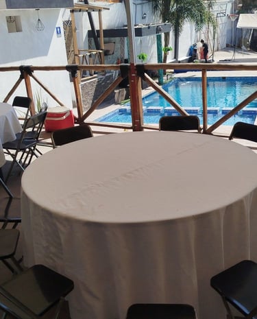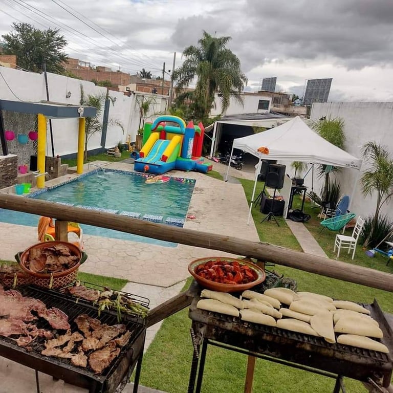 Un espacio fresco, alegre y acogedor, perfecto para disfrutar con amigos y familia. La alberca añade un toque único que convierte cualquier celebración en un día inolvidable.